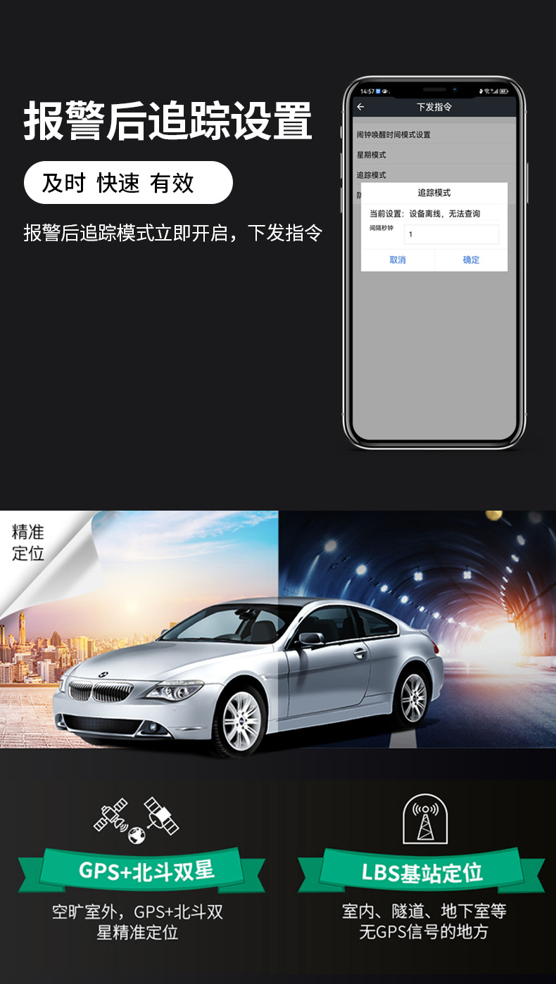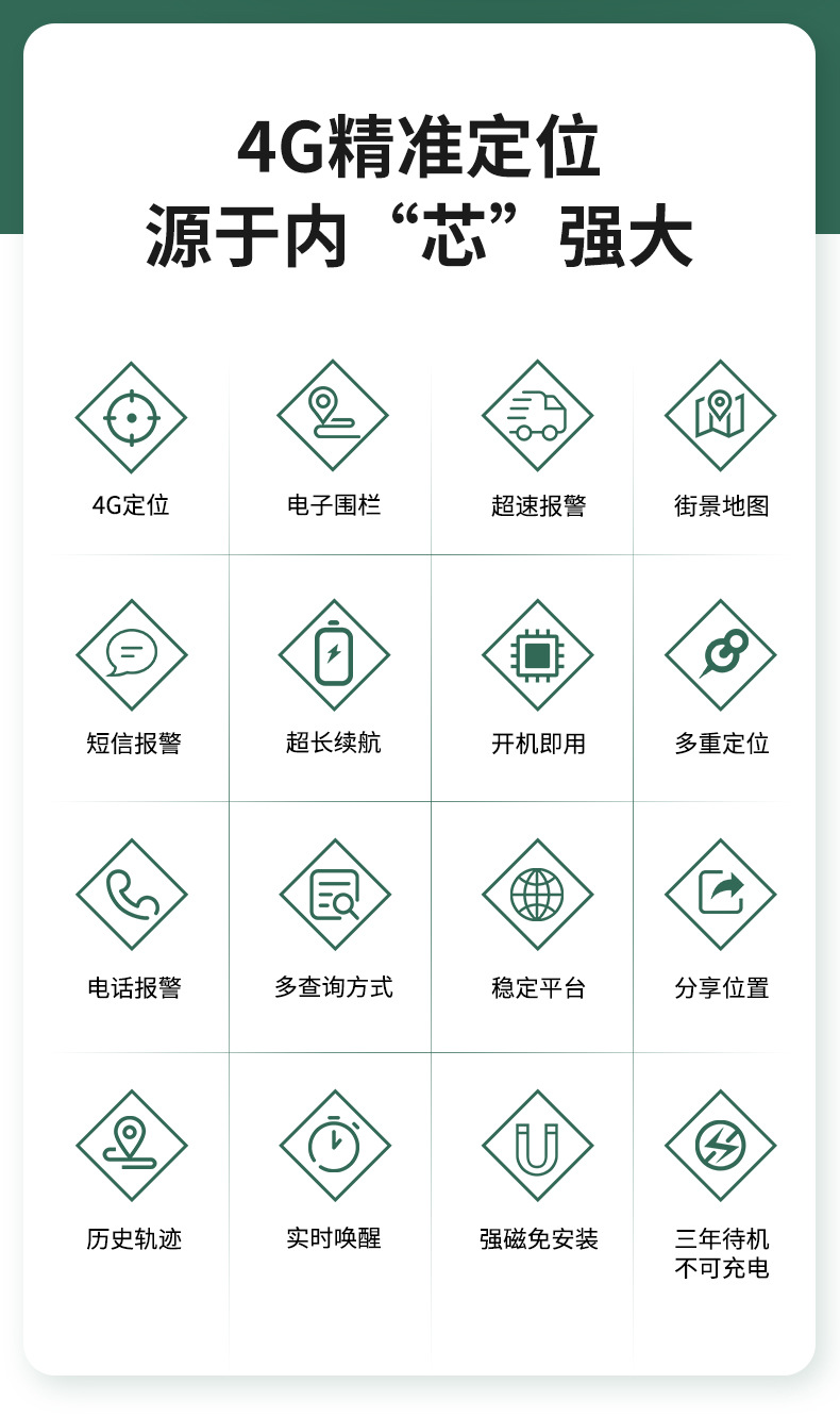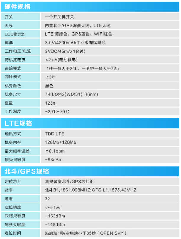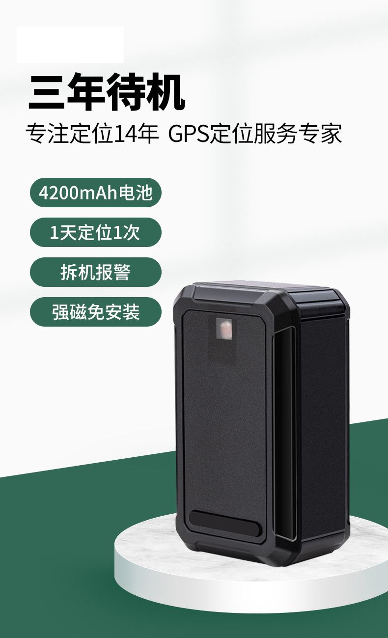 产品概述:4G01是一款专门为车辆与货物设计的便携式定位终端,具有4200mAh锂锰电池,能做到3年的超长待机。体积相对小巧,便于隐蔽安装。同时融合GPS/北斗卫早定位以及LTE TDD通讯技术,只有实时定位追踪、轨迹回放等功能适用于车辆租赁、管理,固定资产管理等需求。