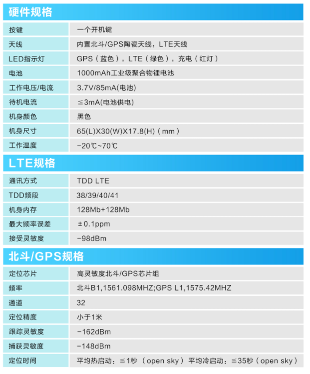 产品概述:4G02是一款可充电使携式定位终端,内置1000mAh聚合物理锂电池。超小机身,使于隐蔽安装。同时融合GPS/北斗卫星定位,以及融合LTE、TDD实时通讯技术,具有实时定位追踪、轨迹回放、广泛应用于多种场景。